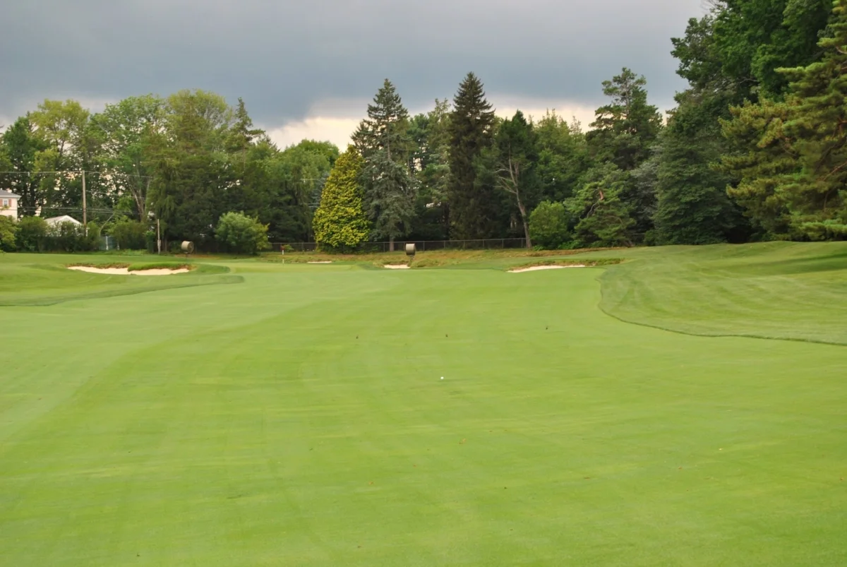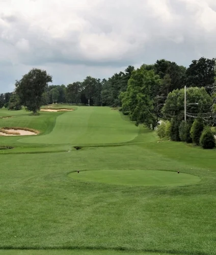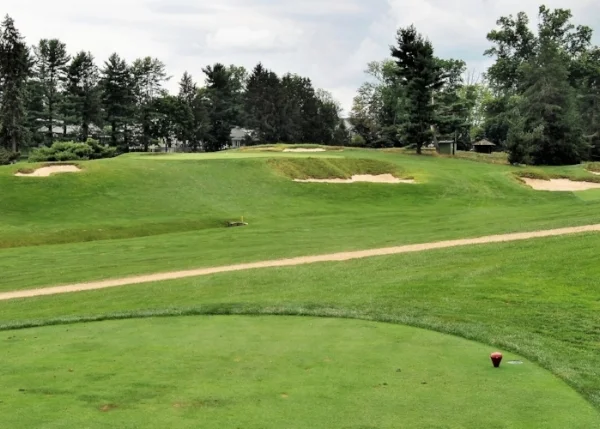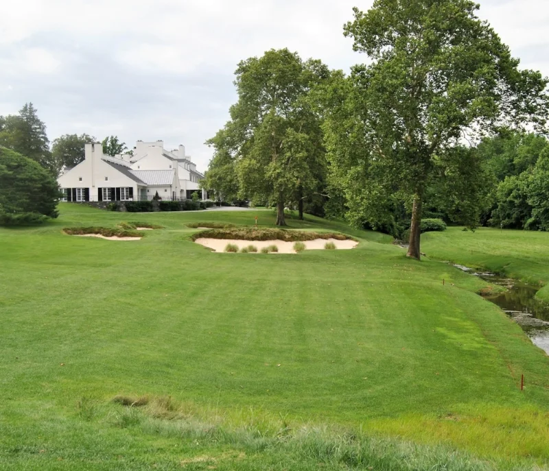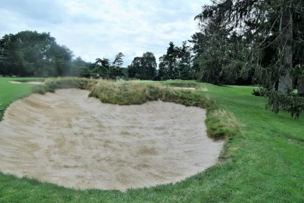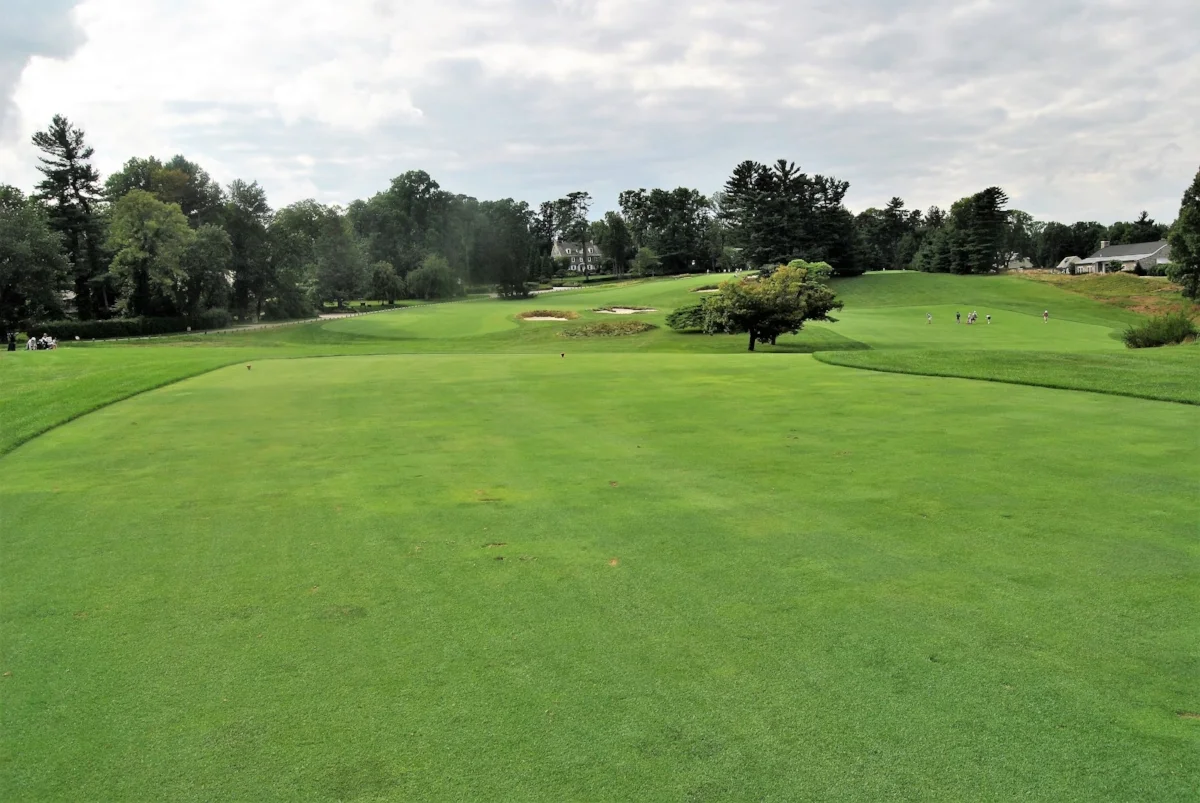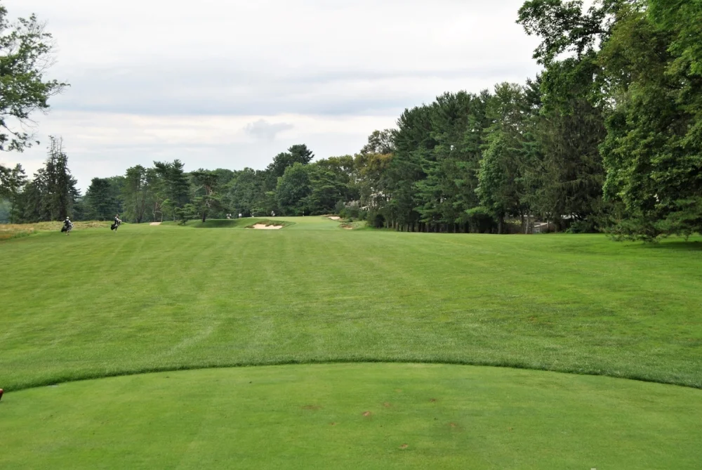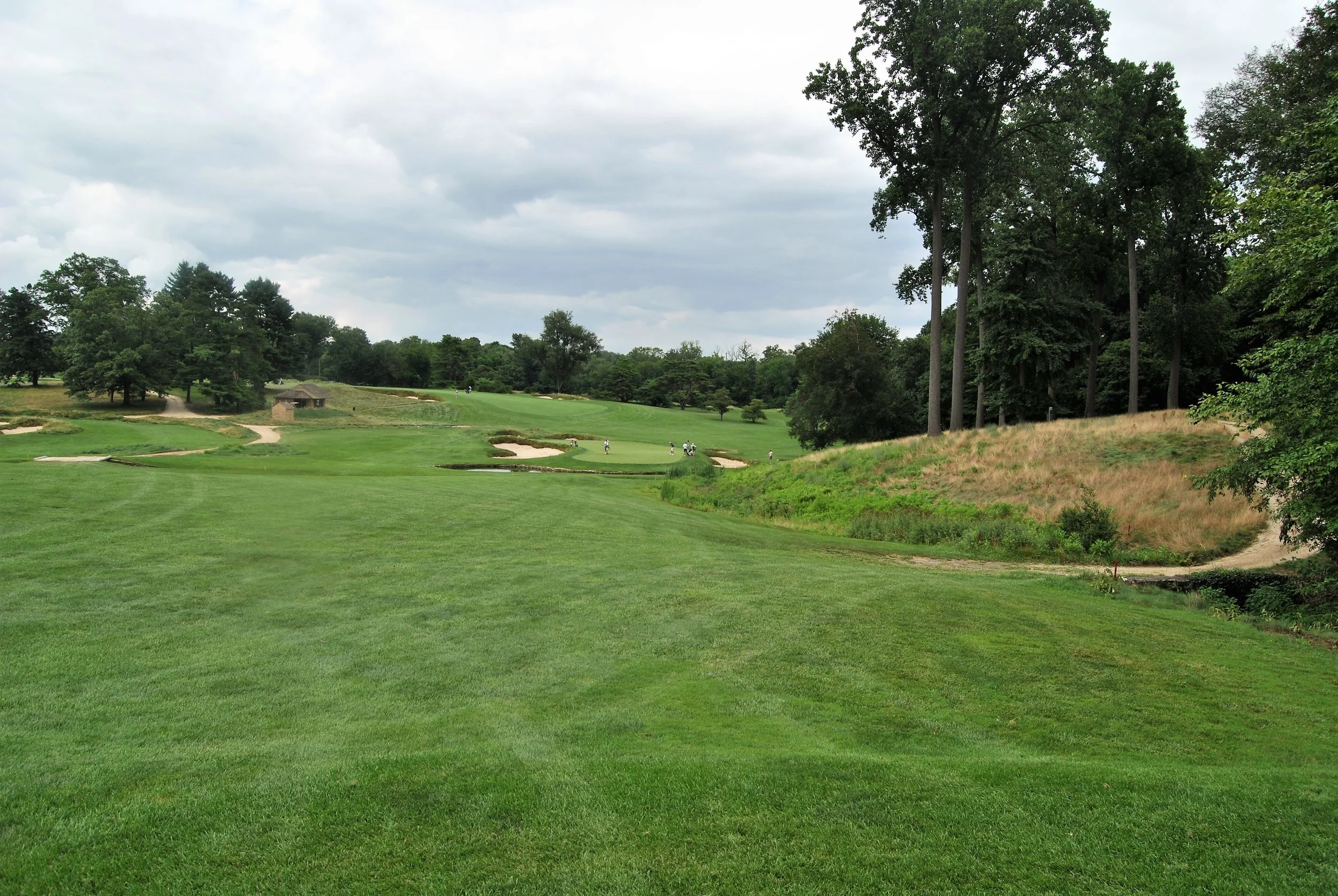 This hole, the 11th one on the East Course at Merion plays only 350 yards from the middle tees. There are bunkers short of the fairway on both the right and the left. The ones on the left are larger and more numerous. There are two trees at the end of the fairway that stand as sentries for the green. There is also a creek that cuts left to right at forty five degrees from the end of the fairway on the left to in front of the green and along the right side.