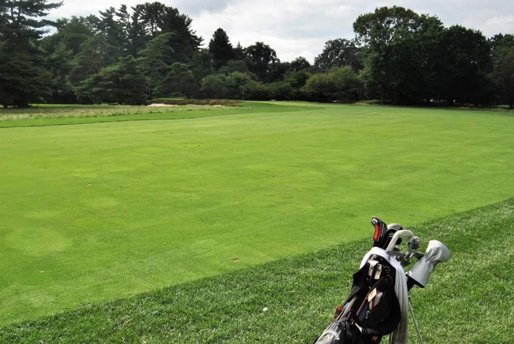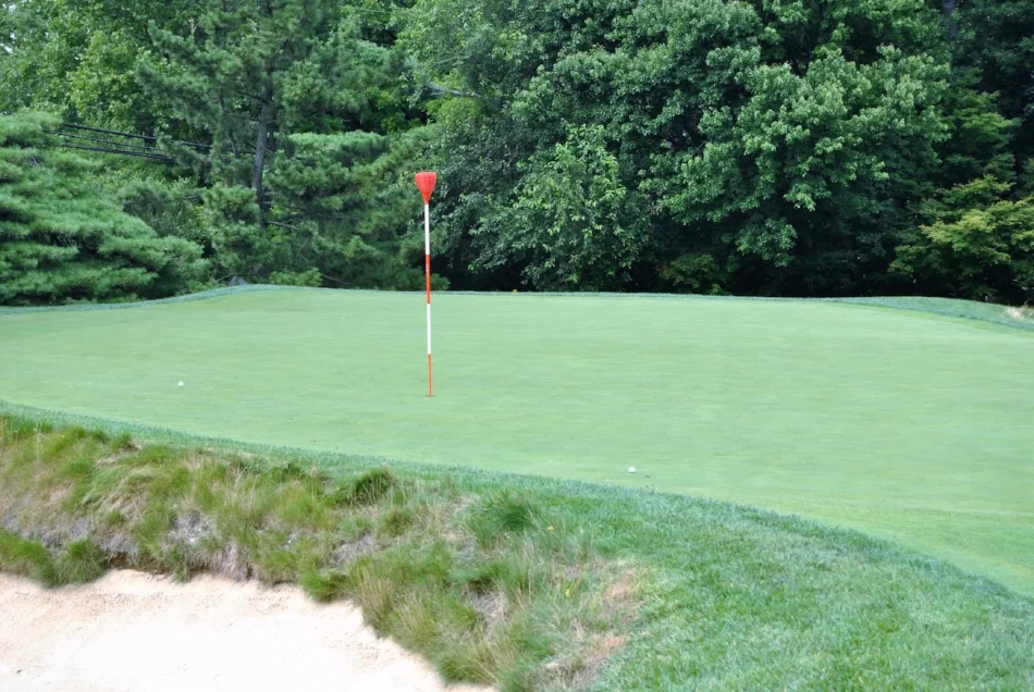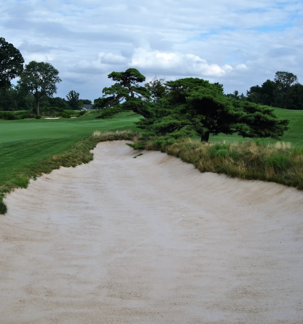 The first hole at Merion is a short 340 yard par 4 with a dogleg of about 45 degrees to the right. The fairway is lined with several bunkers on the left and the right. My ball rested on the sand 95 yards from a back right pin.