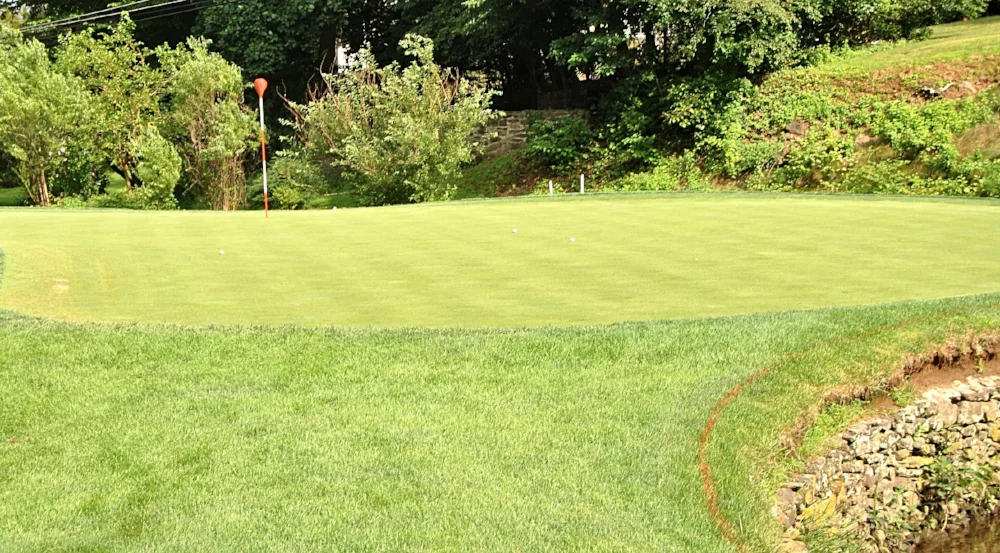 The sixteenth hole was another disaster. I hit my drive into a bunker on the right side of the fairway. The fifteen hole is the only hole on the course that I didn't like. There is what I can only describe as an elevated wall of stone that makes the shot to the green a blind shot. The fairway stops before the wall and continues atop of it. The best I could do after hitting my drive into the bunker was to pitch out to the left side of the fairway. My ball carried too far into the rough. I then attempted an ill-fated shot up and over the wall of stone, and around the trees atop the wall. I didn’t quite make it, but somehow, I found my ball in the junk on top of the stone wall. I hit onto the green and two putted for a double bogey.