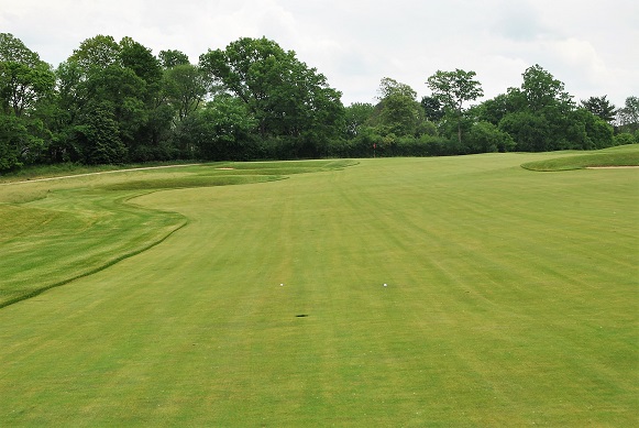 The front nine at Chicago Golf Club opens with a challenge but the last three holes provide a soft landing. The last of the three is a 403-yard par four that is the 11th rated hole on the course. It is one of only two holes where water comes into play. The flat fairway has a diagonal bunker on the left and a cross bunker on the right as it shifts from left to right. I topped my drive and sent a worm burner speeding toward the bunker on the right. The ball rolled through the bunker before coming to rest in the rough just above it.